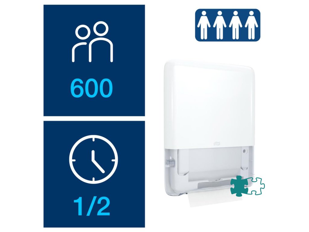 Tork PeakServe® najnovšia inovácia navrhnutá pre vysoko frekventované toalety a umyvárne, kde personál potrebuje maximalizovať čas upratovania a udržať dobrú plynulosť pre návštevníkov. Systém je kompatibilný s Tork PeakServe® nadväzujúcimi utierkami na ruky. Má vysokú kapacitu až 1 230 utierok, ktoré dokáže dávkovať rýchlo a plynulo bez prerušenia. Stlačené náplne sa rýchlo dopĺňajú a môžete ich kedykoľvek doplniť. Ľahko sa uskladňujú a prepravujú, vďaka čomu umožňujú personálu sústrediť sa na upratovanie a nie na dopĺňanie.Výška - 49.1 cm