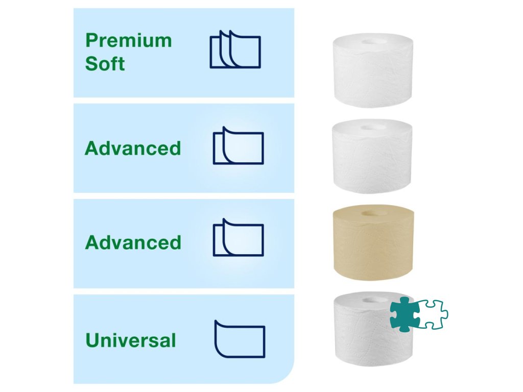 Tork Mid-size Twin zásobník na bezdutinkový toaletný papier je ideálny pre nízko až stredne frekventované toalety a umyvárne s vysokým dôrazom na spokojnosť zákazníkov. Zabezpečuje vysokú účinnosť a neustálu dostupnosť toaletného papiera pre hostí tým, že do neho možno vložiť deväťkrát viac papiera, ako sa nachádza na dvoch bežných kotúčoch.Kompaktný a úsporný dizajn vhodný do menších toaliet a umyvární