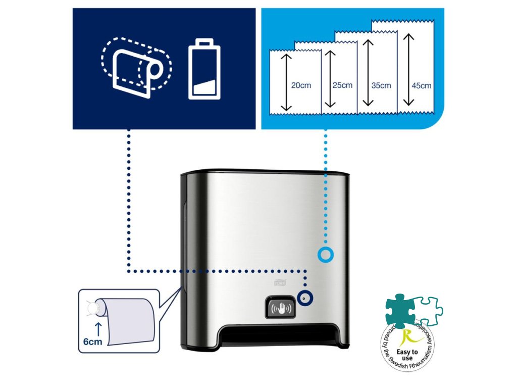 Tork Matic® bezdotykový zásobník na papierové utierky na ruky v kotúči s Intuition™ senzorom v imidžovom dizajne vytvára sofistikovaný dojem. Bezdotykové dávkovanie po jednom útržku znižuje spotrebu a zlepšuje hygienu. Zásobník disponuje s postranným okienkom na kontrolu stavu.Materiál: kov/plast