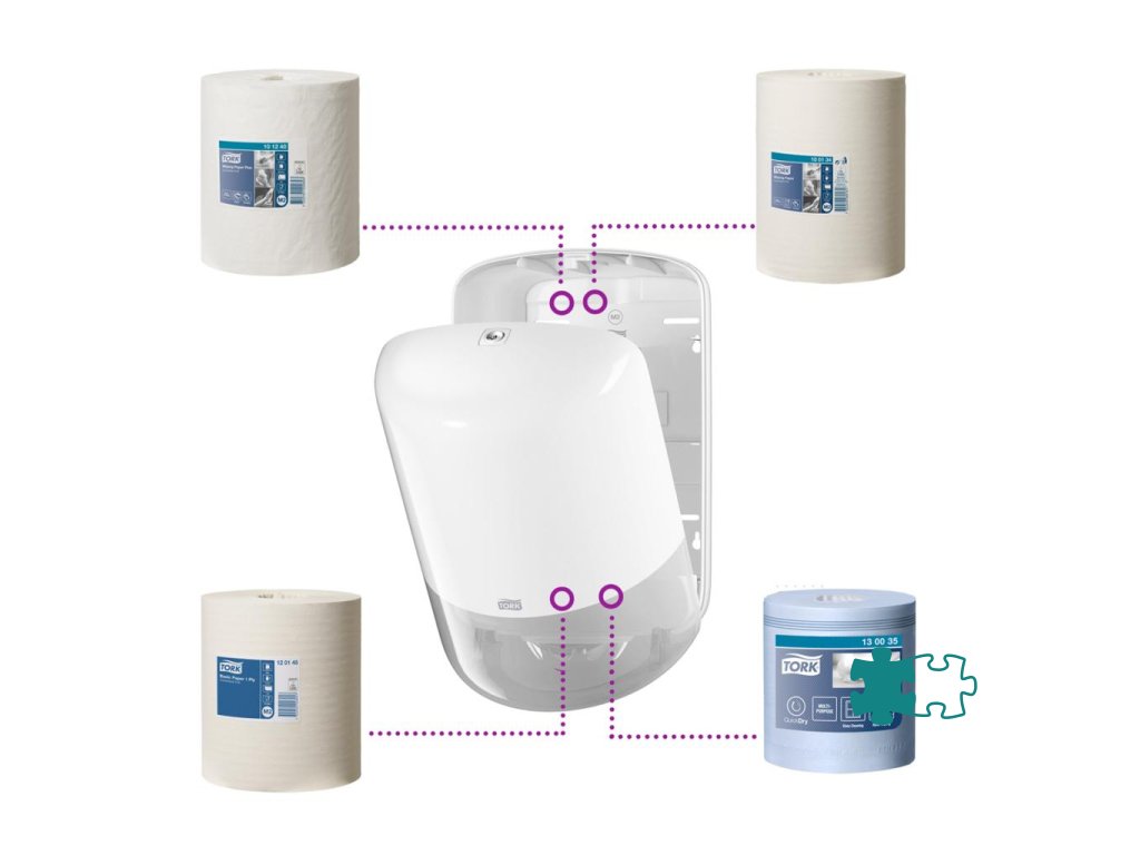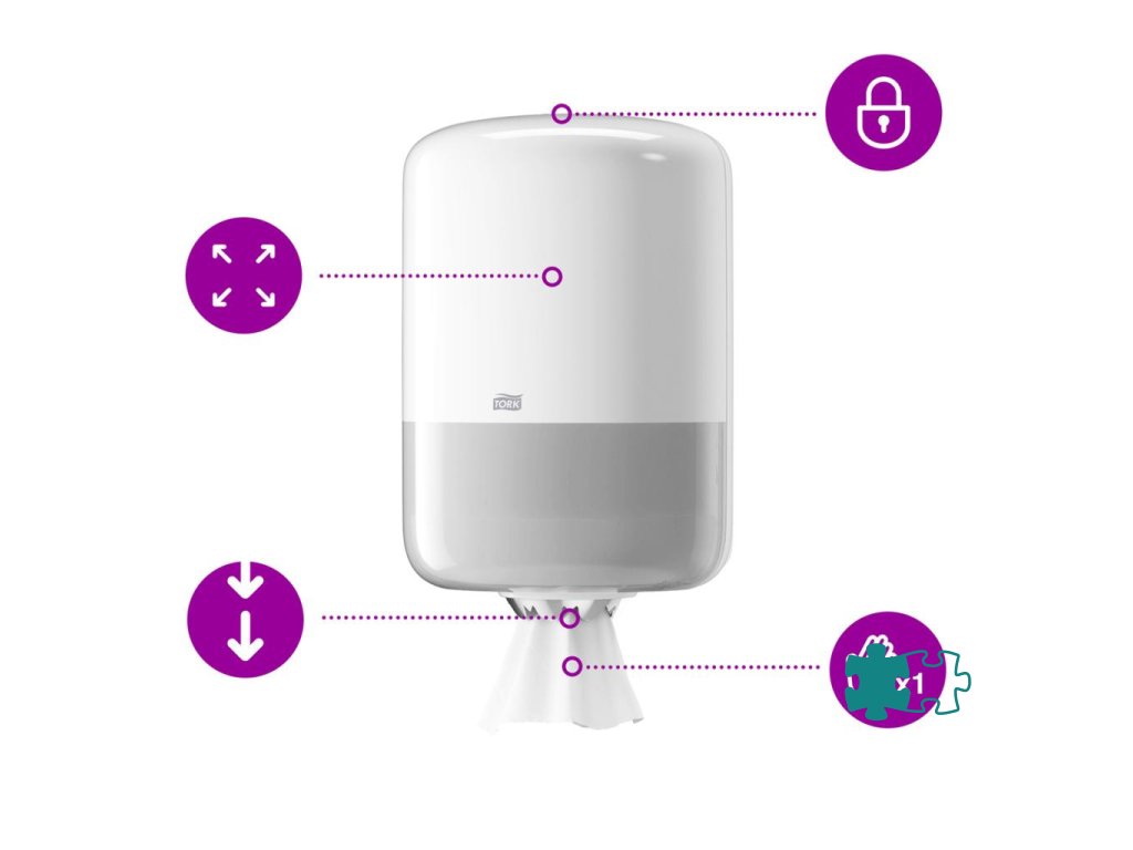 Tork® zásobník so stredovým odvíjaním s dizajnom Elevation je vysoko kompaktné, viacúčelové riešenie pre profesionálne prostredia, kde sú na utieranie povrchu potrebné obe ruky. Rýchle utieranie povrchov vďaka plynulému neobmedzenému prúdu, čo umožňuje používateľom zobrať toľko, koľko vyžadujú ich úlohy.Rozmery zásobníka (šxdxv): 23,9 x 22,7 x 36cm