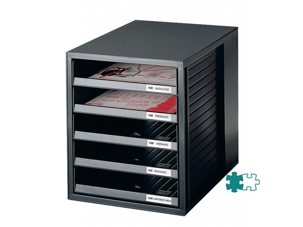 Plastový zásuvkový box s piatimi otvorenými zásuvkami. Zmestí sa do ľubovoľnej police určenej pre zakladače, pretože výška boxu je totožná s výškou pákových zakladačov (275 × 330 × 320 mm).Farba boxu/zásuvky: čierna/čierna