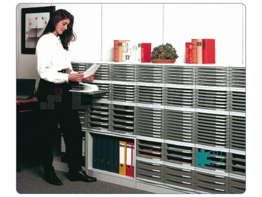 Box z modulárneho systému zásuvkových boxov s horizontálnym aj vertikálnym spájaním. Model so zatvorenými zásuvkami výšky 50 mm a zarážkou chrániacou zásuvky pred úplným vysunutím. Súčasťou sú identifikačné menovky na označenie zásuviek.Telo boxov vo svetlosivej farbe, zásuvky tmavosivé. Rozmery (š × v × h) 30 × 30,7 × 38,2 cm.Výška zásuvky: 5 cm
