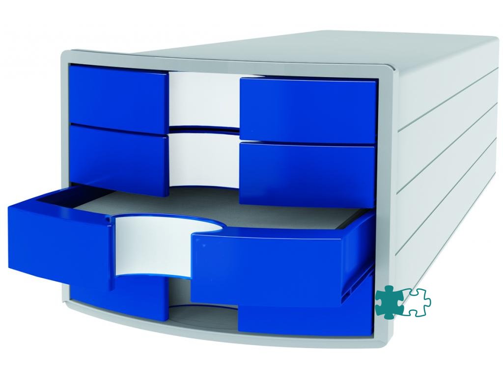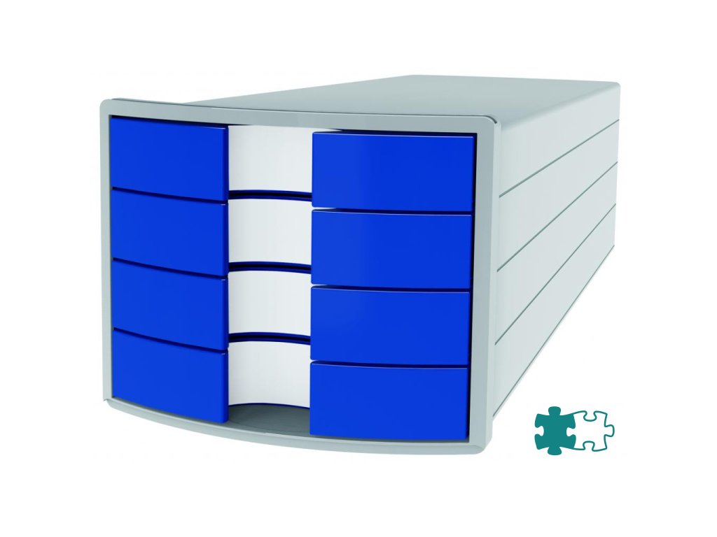 Box so štyrmi zatvorenými zásuvkami v tvare počítačového monitora.Rozmery (š × v × h) 294 × 235 × 368 mm.Farba boxu/zásuvky: sivá/modrá