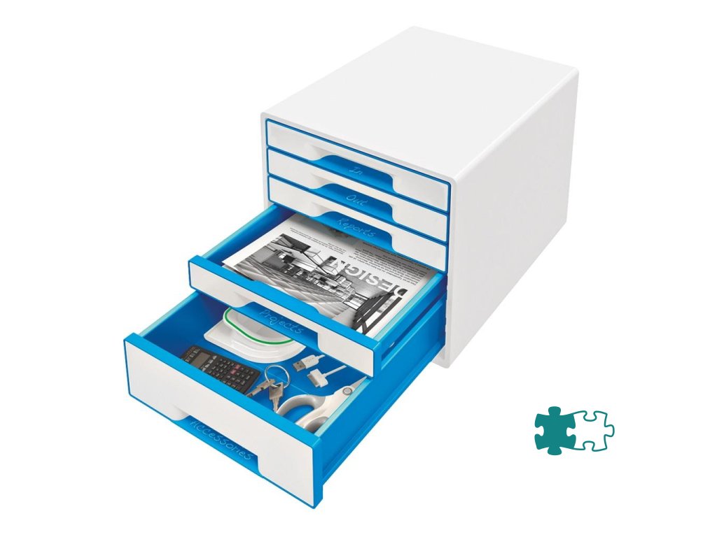 Box, dopĺňajúci produktovú radu Leitz WOW. Ľahko vysúvateľné 4 malé a 1 veľká zásuvka so zarážkou proti úplnému vysunutiu, jednoduché otváranie a zatváranie. Gumové nožičky pre lepšiu stabilitu, rozlišovač na popis zásuvky. Rozmery 287 × 270 × 363 mm.Dodatočné parametre