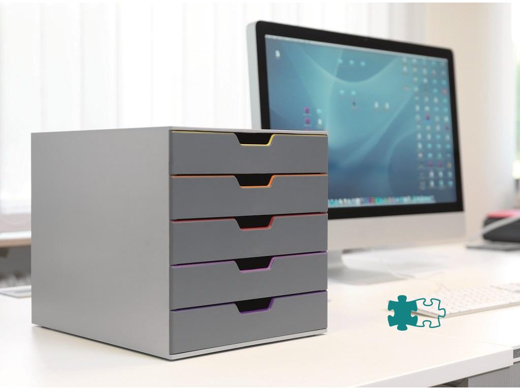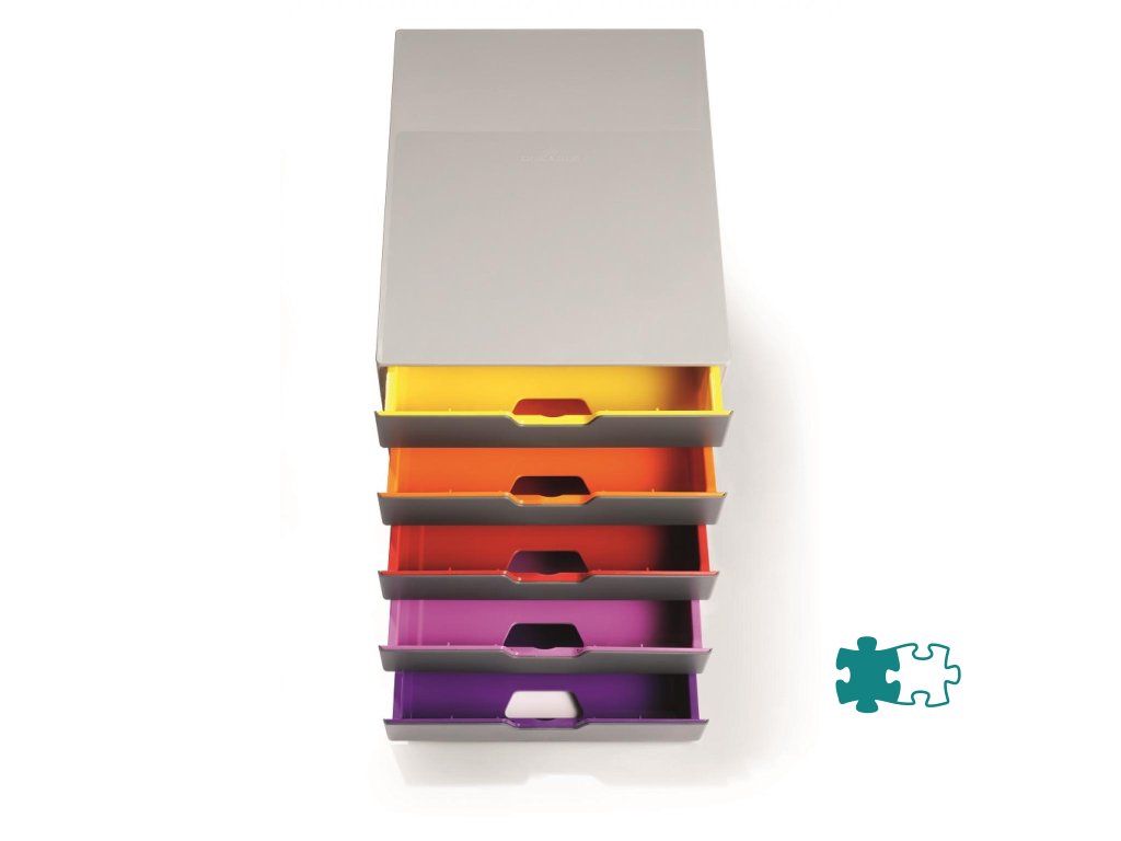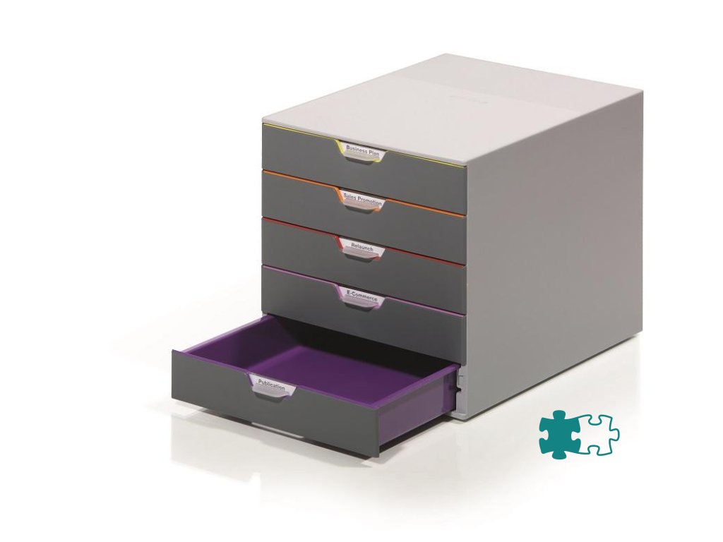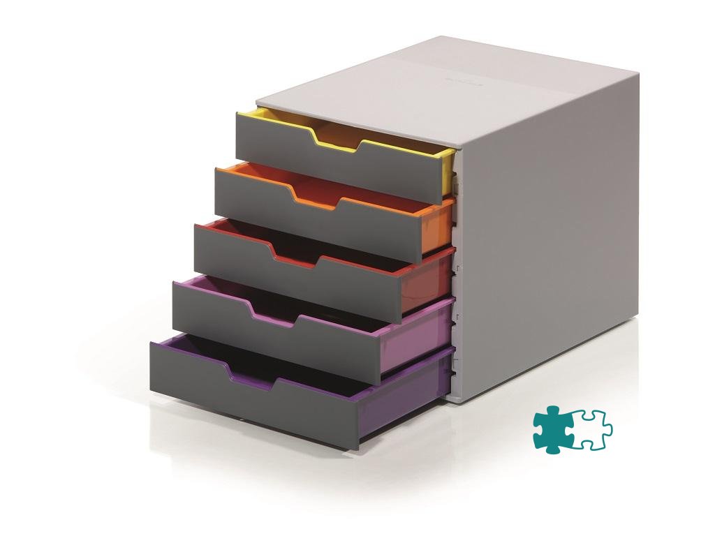 Boxy s 5 zásuvkami s vnútrami dúhových farieb dodajú kancelárii nádych elegancie. Pri ich zatvorení farebné línie iba jemne vystupujú z elegantnej sivej farby, pri otvorení sú žiarivé farby dúhy potešením pre oči. Dodávané s priehľadnými plastovými indexami na označenie obsahu. Boxy sú stohovateľné, zásuvky zabezpečené proti vypadnutiu. Materiál najkvalitnejší ABS plast, tichý a ľahký posun zásuviek, spodná strana s protišmykovou ochranou. Víťaz Product design award 2013. Rozmery (š × v × h) 292 × 280 × 356 mm.Dodatočné parametre