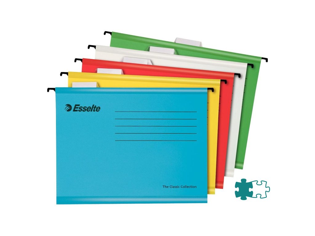 Závesné obaly Esselte kolekcie Classic vyrobené z pevného kartónu. Lisované dno obalu dovoľuje zvýšiť kapacitu na 30 mm. Súčasťou obalu je násuvný index z priehľadného plastu s výmenným papierovým štítkom. Formát A4, rozpätie vodiacich líšt 330 mm. Dodávané spolu s 5 kartónovými prúžkami na spevnenie dna. Balenie 10 ks v mixe farieb.Farba: mix jasných farieb