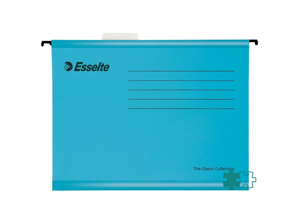 Závesné obaly Esselte kolekcie Classic vyrobené z pevného kartónu. Lisované dno obalu dovoľuje zvýšiť kapacitu na 30 mm. Súčasťou obalu je násuvný index z priehľadného plastu s výmenným papierovým štítkom. Formát A4, rozpätie vodiacich líšt 330 mm.Farba: jasná modrá