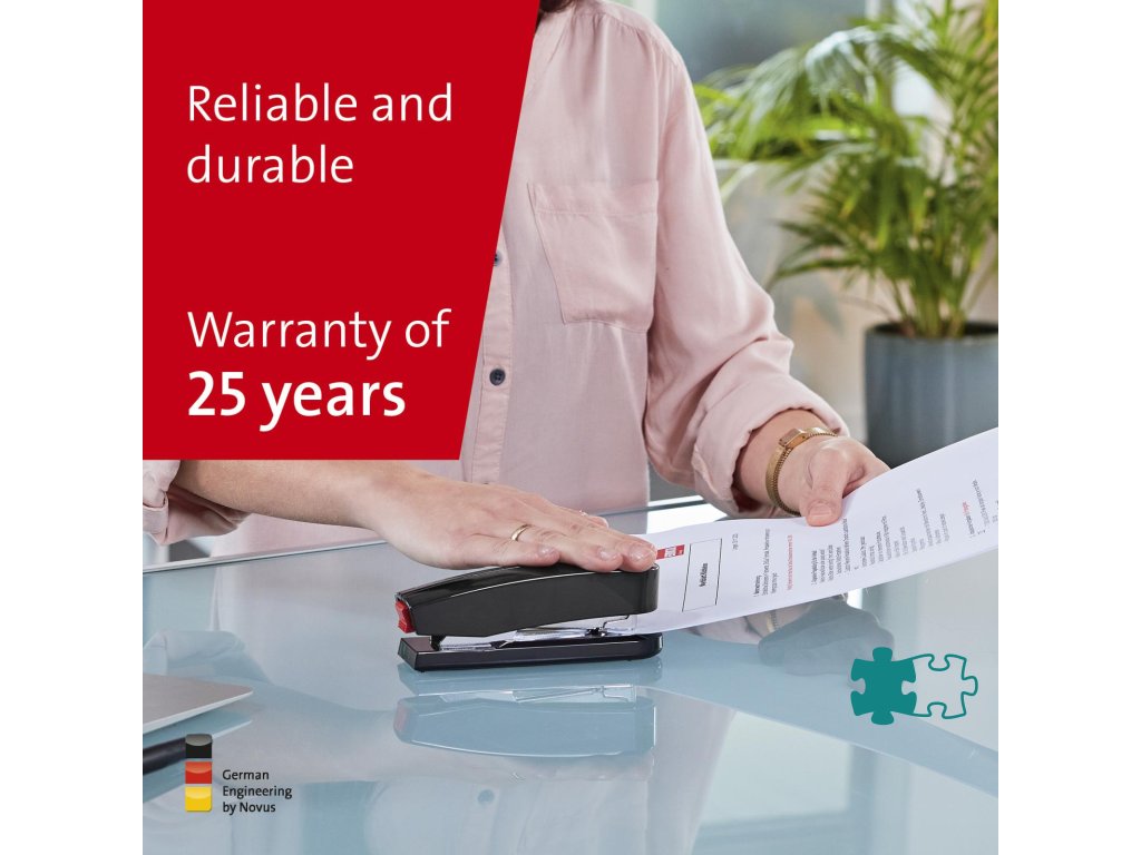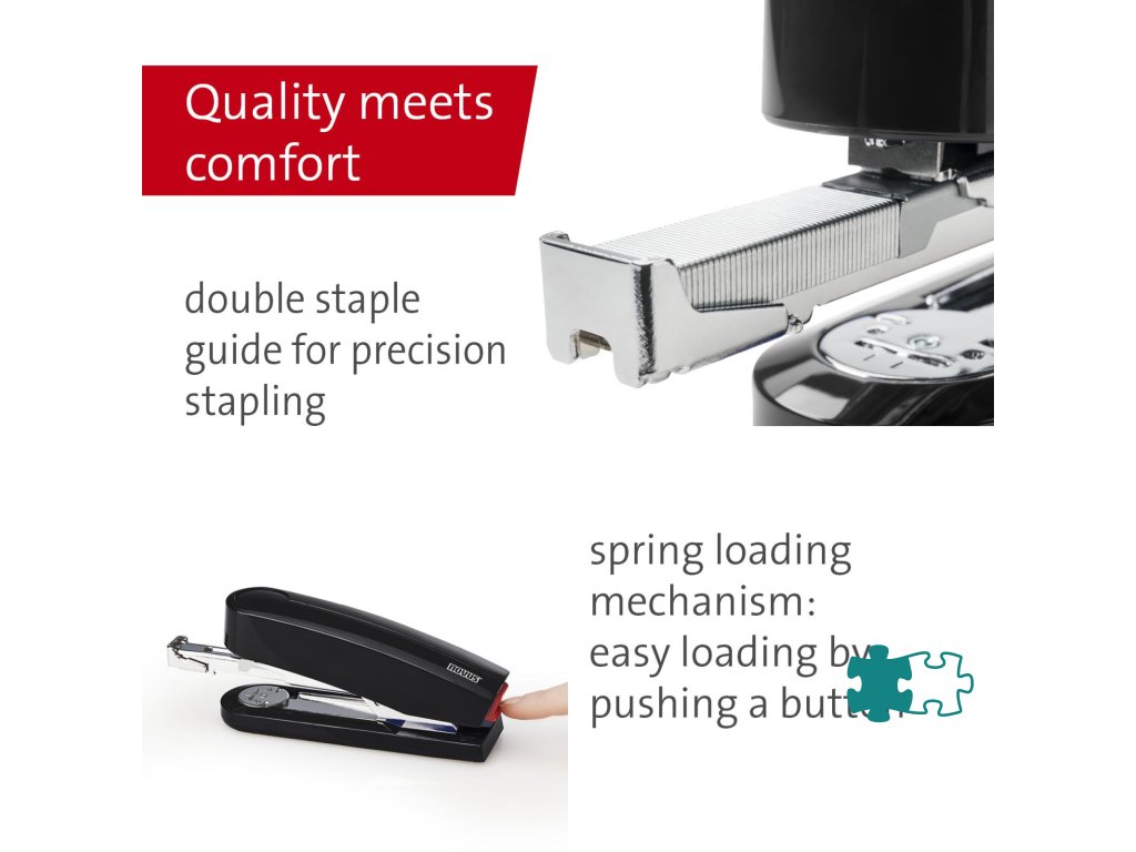 Kompaktná vysokovýkonná zošívačka v kovovom prevedení s plastovým vrchným dielom a dvojitým vedením spiniek. Kapacita náplne 100 spiniek 24/6 - 8 alebo 150 spiniek 26/6 - 8. Hĺbka zošívania 6,5 cm. Hmotnosť 245 g. Záruka 25 rokov.Farba: čierna