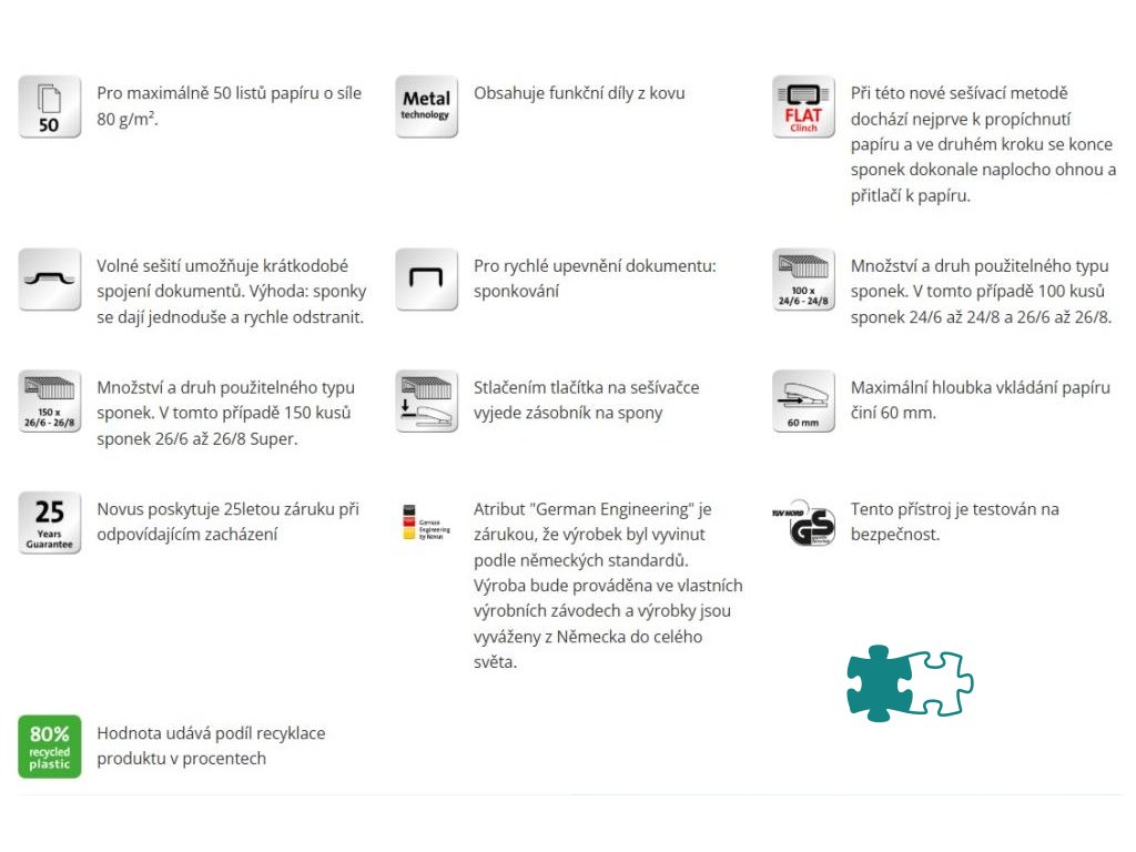 Celokovová kancelárska zošívačka pre každodenné profesionálne použitie z kolekcie šetrnej k životnému prostrediu re+new, s lesklým plášťom z 81% recyklovaného plastu. Dvojité vedenie spiniek, kapacita náplne 100 spiniek 24 / 6 - 8 alebo 150 spiniek 26 / 6 - 8. Hĺbka zošívania 6,5 cm. Hmotnosť 245 g. Záruka 25 rokov. Súčasťou balenia je 200 spiniek 24 / 6 DIN SUPER. Kapacita 40 listov. Farba čierna.Dodatočné parametre