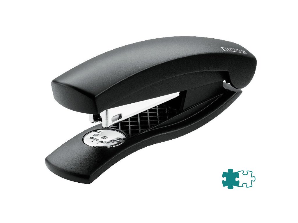 Kancelárska zošívačka na stôl aj do ruky v modernom dizajne. Zásobník spiniek s plastovým osadením a jednoduchým vedením spiniek. Kapacita náplne 100 spiniek 24/ 6 alebo 26/ 6. Hĺbka zošívania 6,5 cm. Hmotnosť 140 g.Farba: čierna