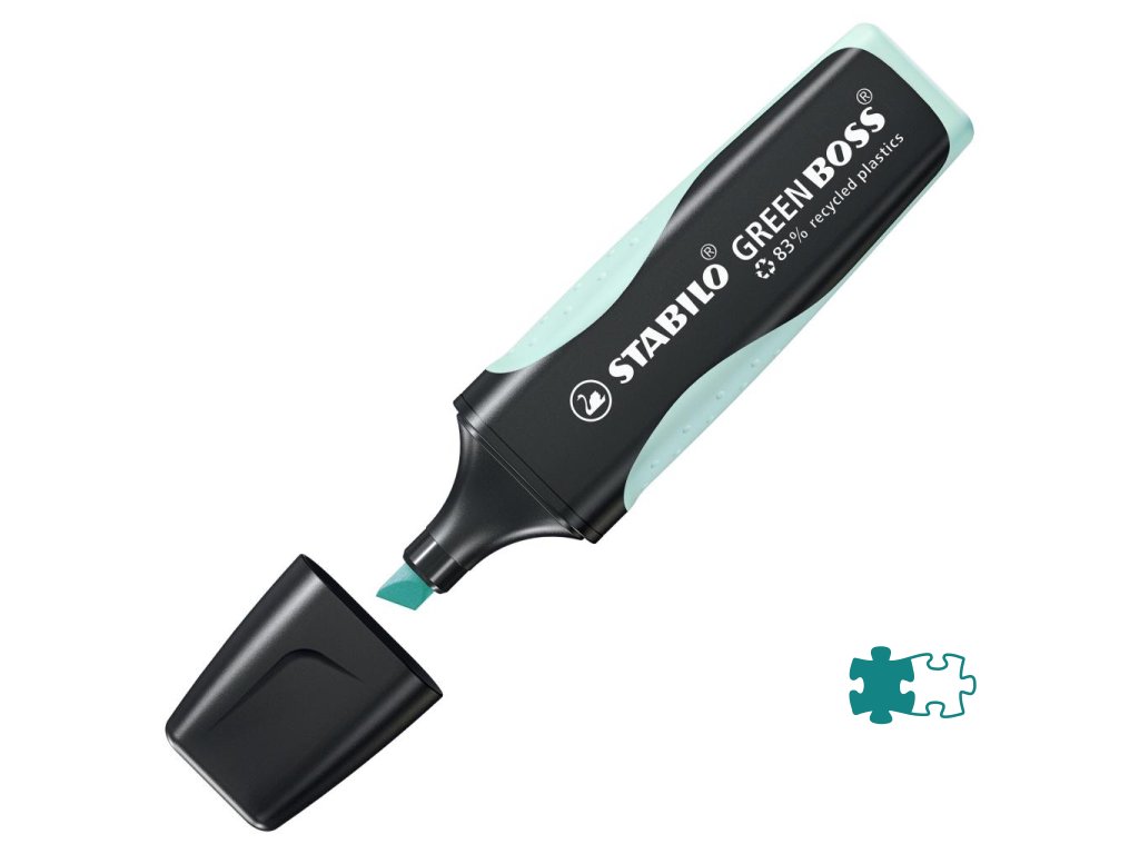 STABILO GREEN BOSS je zvýrazňovač vyrobený z 83% recyklovaného plastu pre školákov, študentov, učiteľov a kancelárskych pracovníkov, ktorí sú ohľaduplní k životnému prostrediu. Ekologický zvýrazňovač je k dispozícii v trendových pastelových a svetlých farbách! Technológia STABILO Anti-Dry-Out chráni pred vysychaním po dobu 4 hodín a zaisťuje koncentrovanú prácu. Značkuje a podčiarkuje v dvoch šírkach stopy 2 a 5 mm. Vďaka protišmykovej zóne úchopu leží bezpečne v ruke. Farba pastelová tyrkysová. Väčšie balenie 10 kusov.- Zvýrazňovač vyrobený z 83 percent recyklovaného plastu