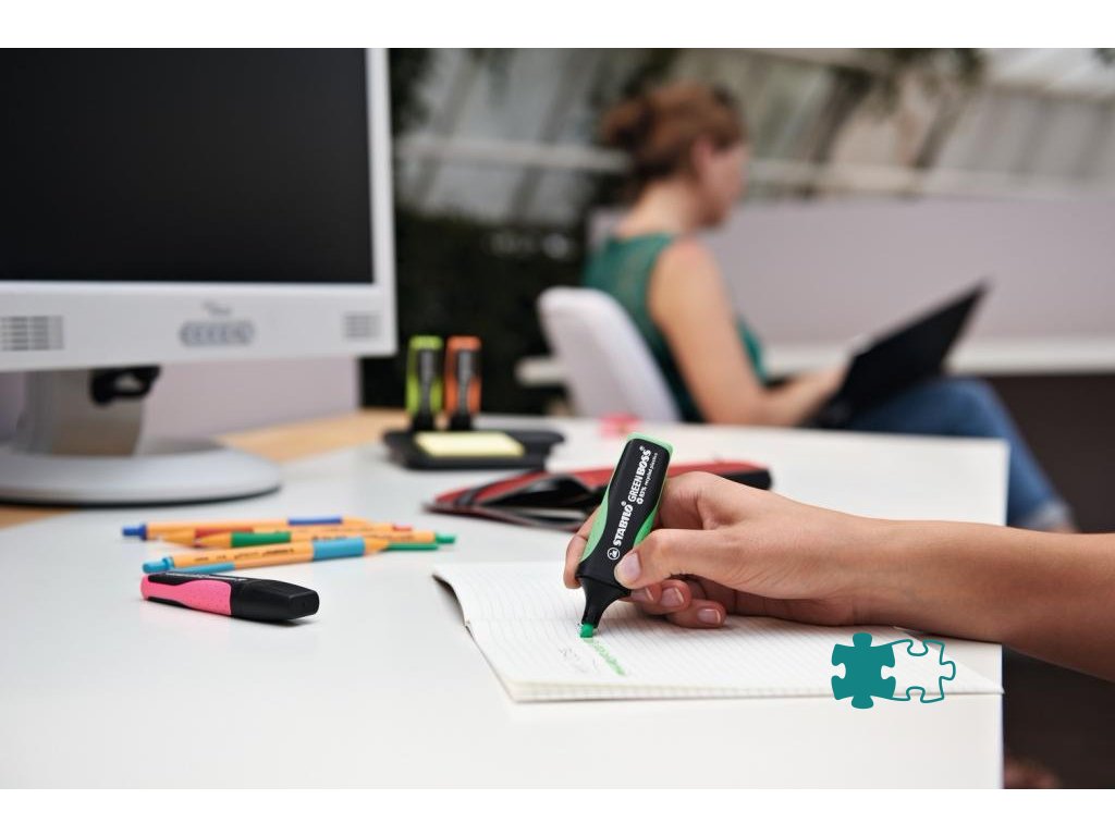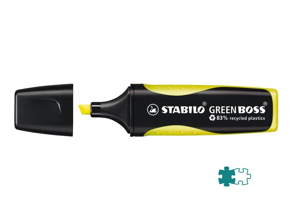 STABILO GREEN BOSS. Zvýrazňovač vyrobený z 83% recyklovaného plastu pre školákov, študentov, učiteľov a zamestnancov kancelárie, ktorí sú ohľaduplní k životnému prostrediu. Štýlový dizajn s protišmykovou zónou úchopu. Technológia STABILO Anti-Dry-Out chráni pred vysychaním po dobu 4 hodín a zaisťuje koncentrovanú prácu. Zvýrazňovač je možné ľahko a pohodlne doplniť náplňami STABILO BOSS ORIGINAL. Atrament na vodnej báze. 2 šírky stopy 2 + 5 mm. Farba žltá. Väčšie balenie 10 kusov.- Zvýrazňovač vyrobený z 83% recyklovaného plastu